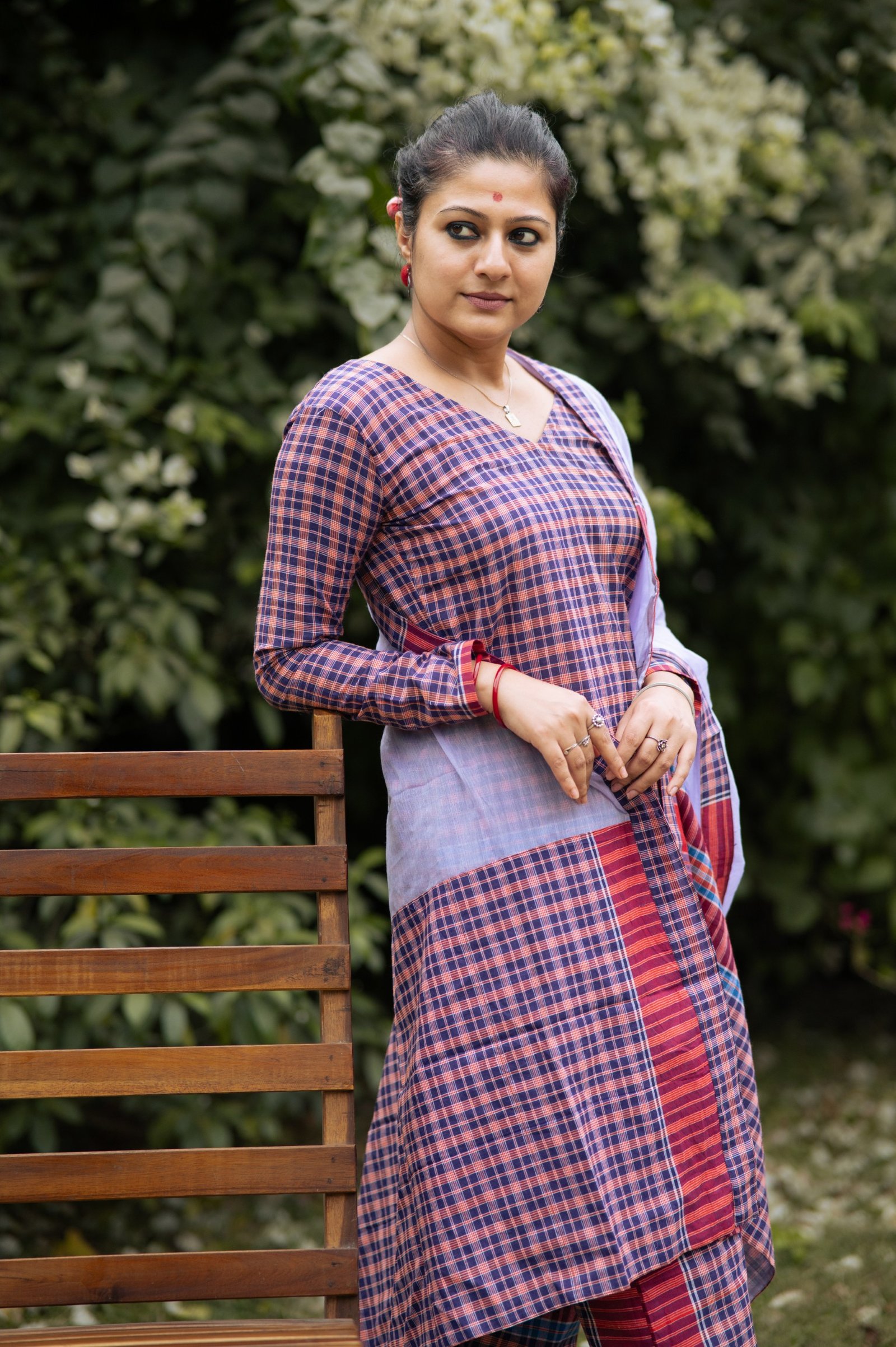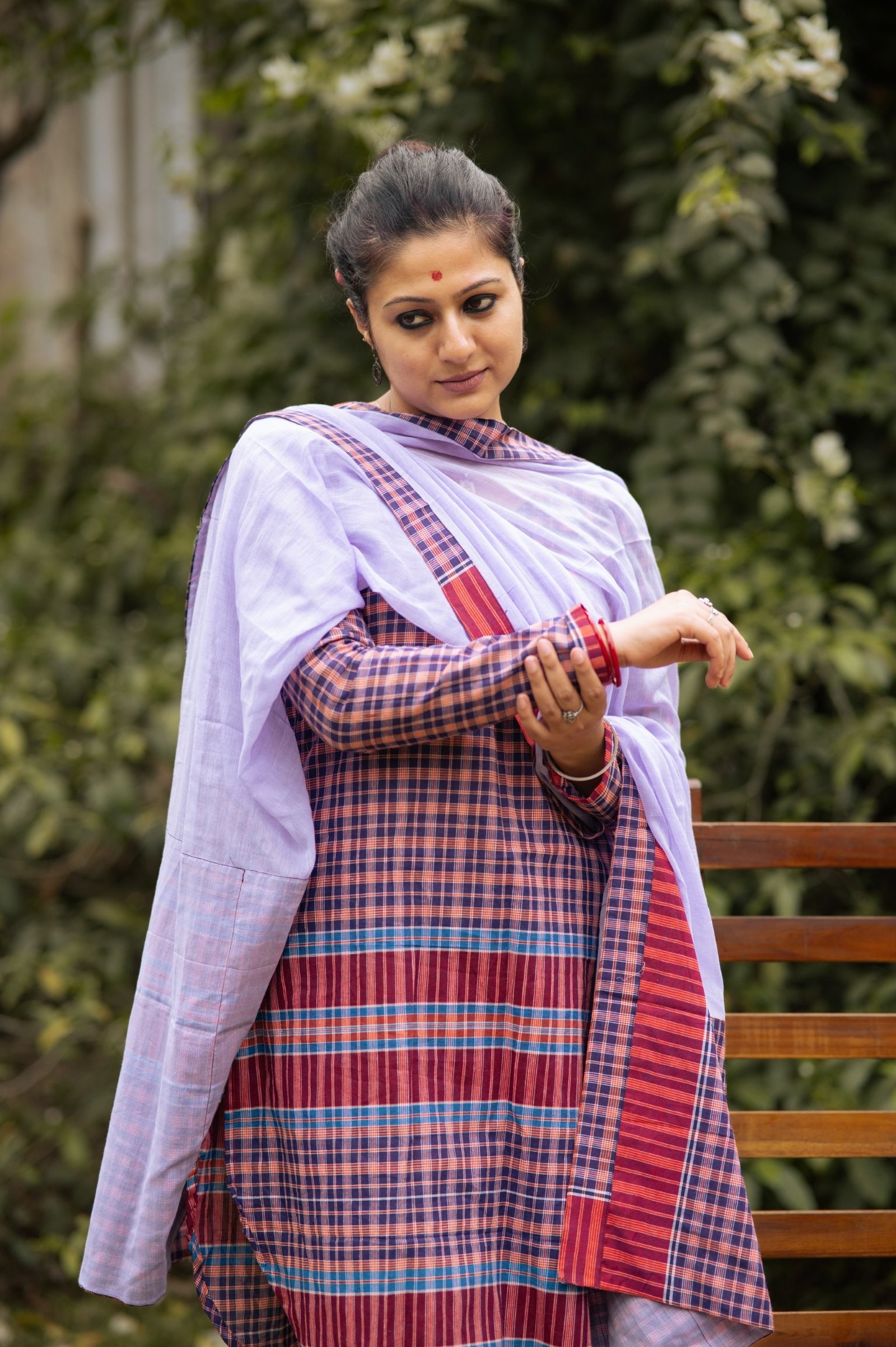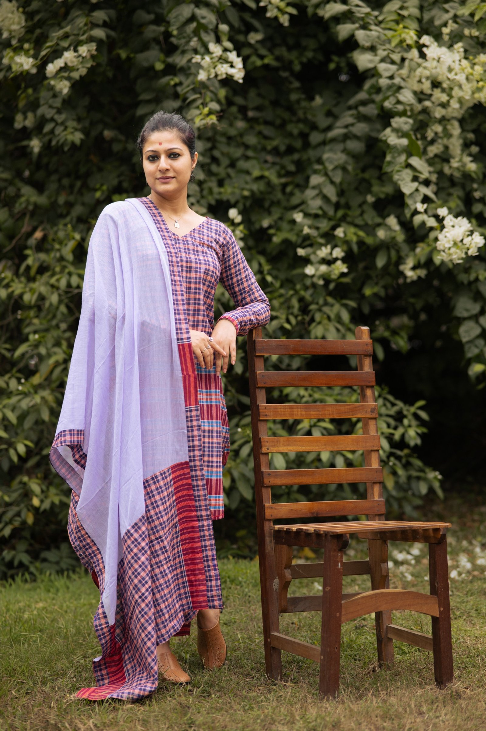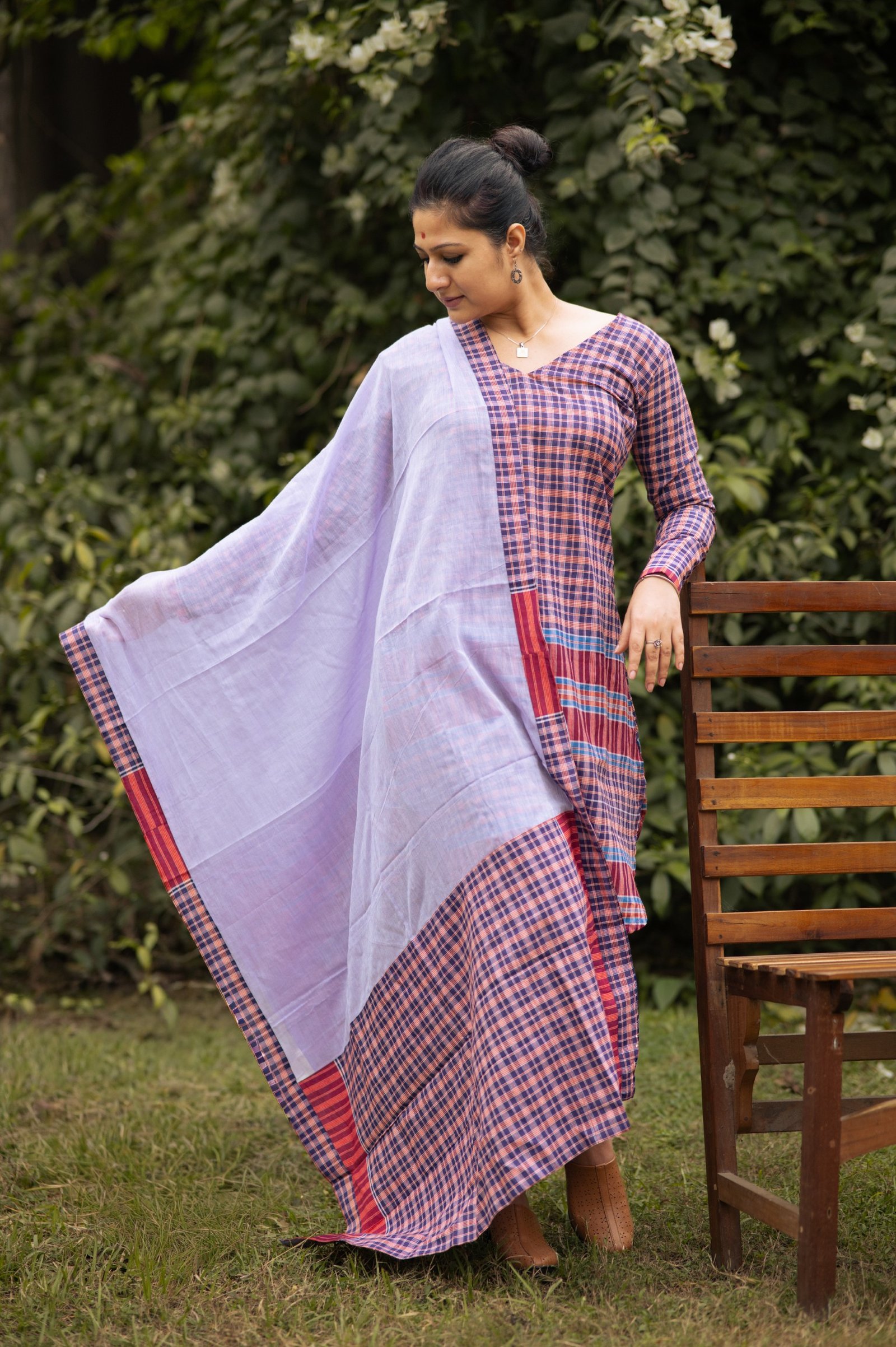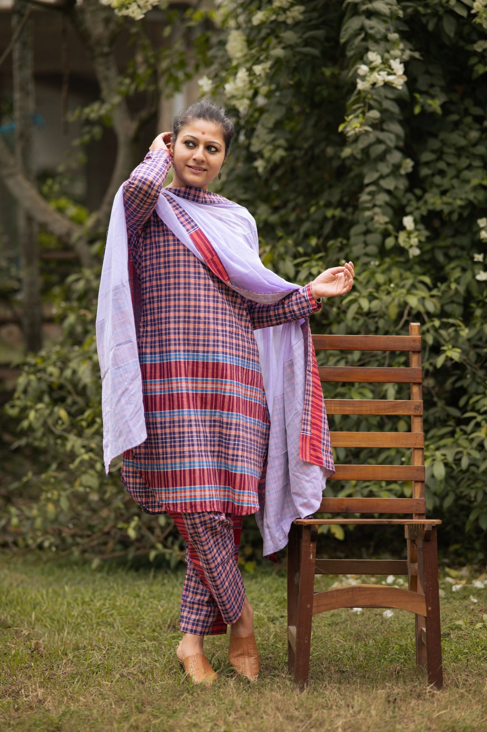 This V-neck gamchha top with easy straight pants brings comfort and character together. The mauve mul dupatta adds a soft, romantic contrast — a look that flows, breathes, and feels beautifully understated.