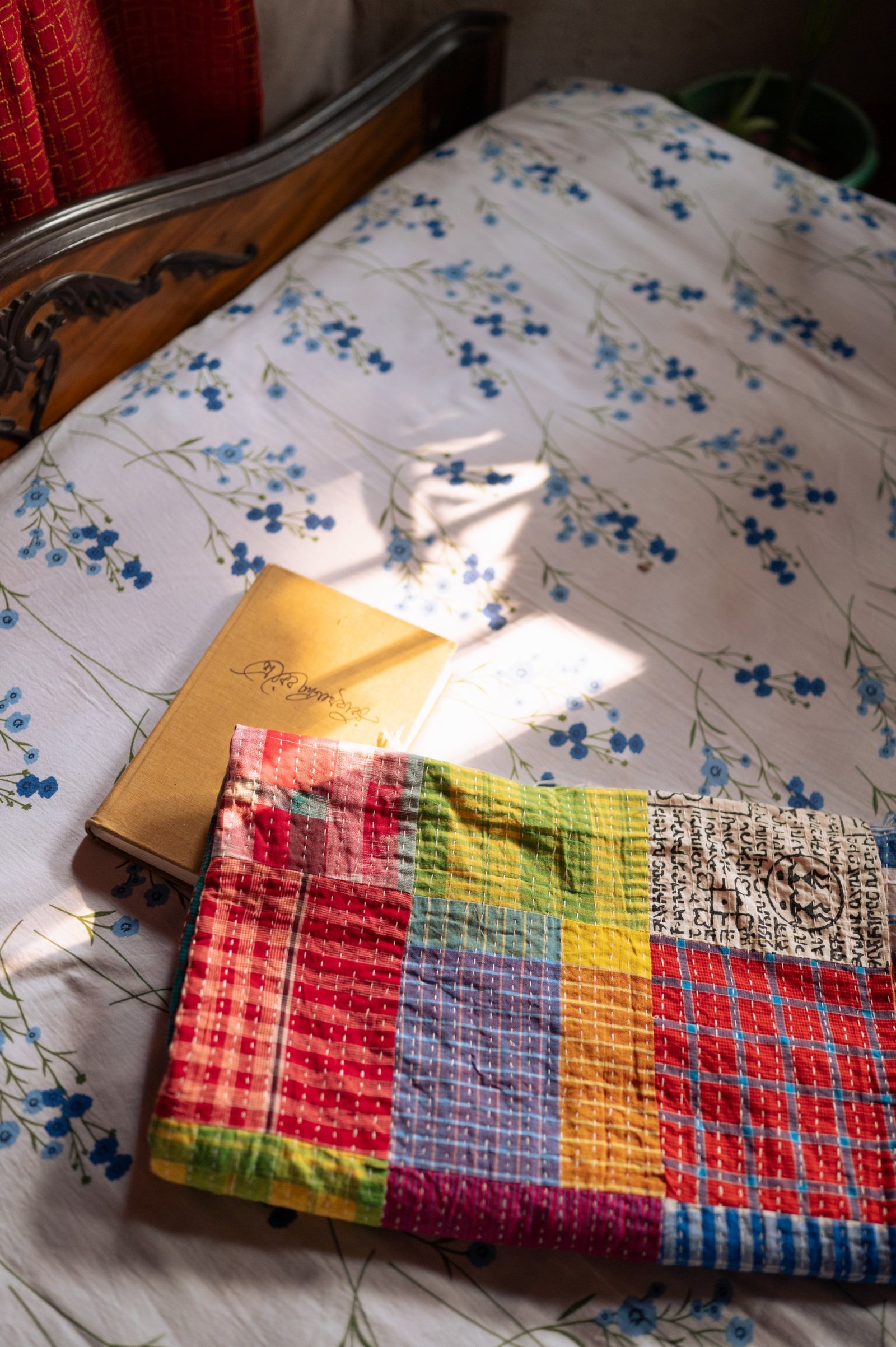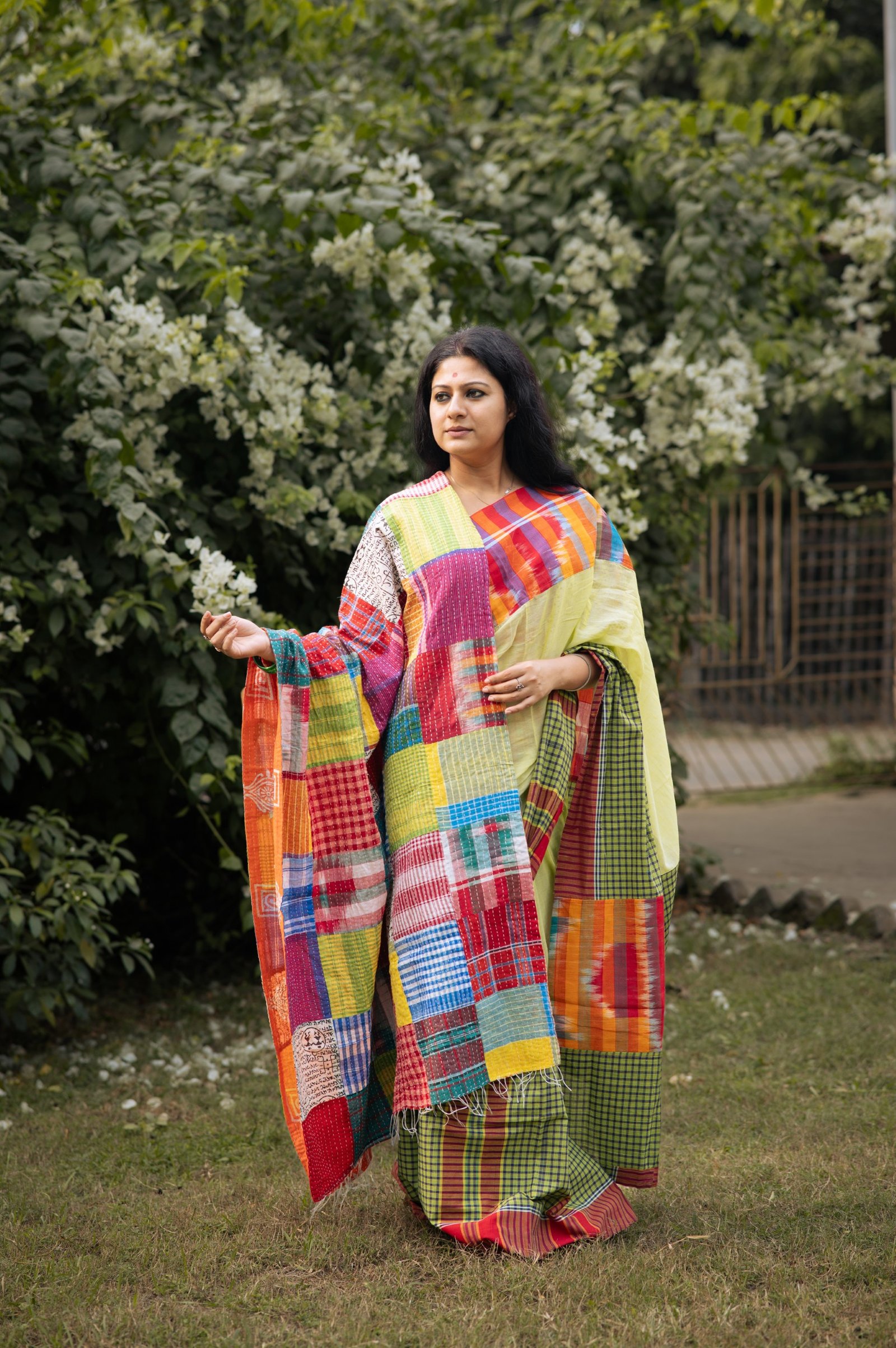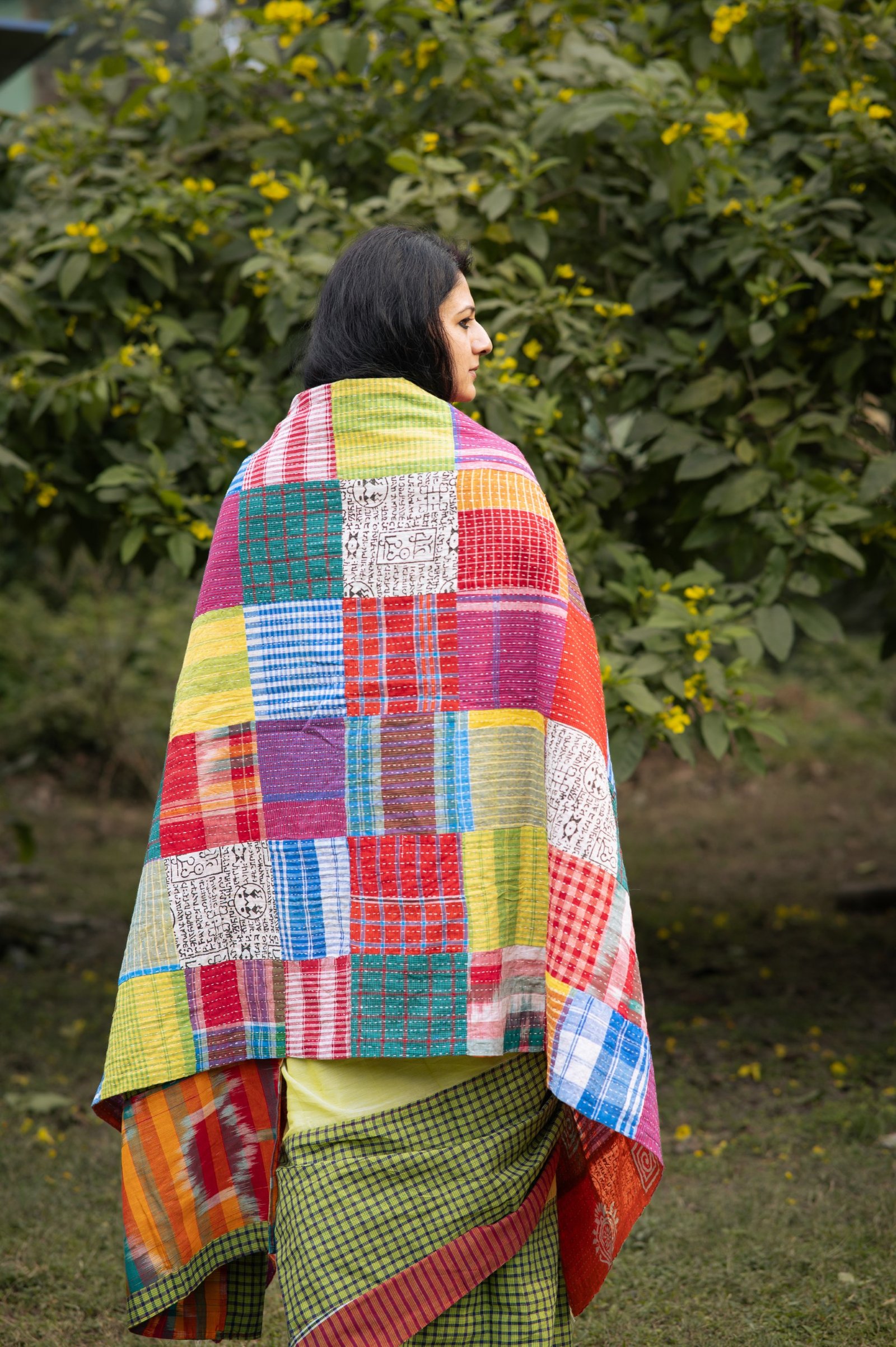Handcrafted with gamchha patchwork and soft kantha stitches, this piece carries the comfort of home in every thread. Light, cosy, and full of stories — a warmth you can wear.