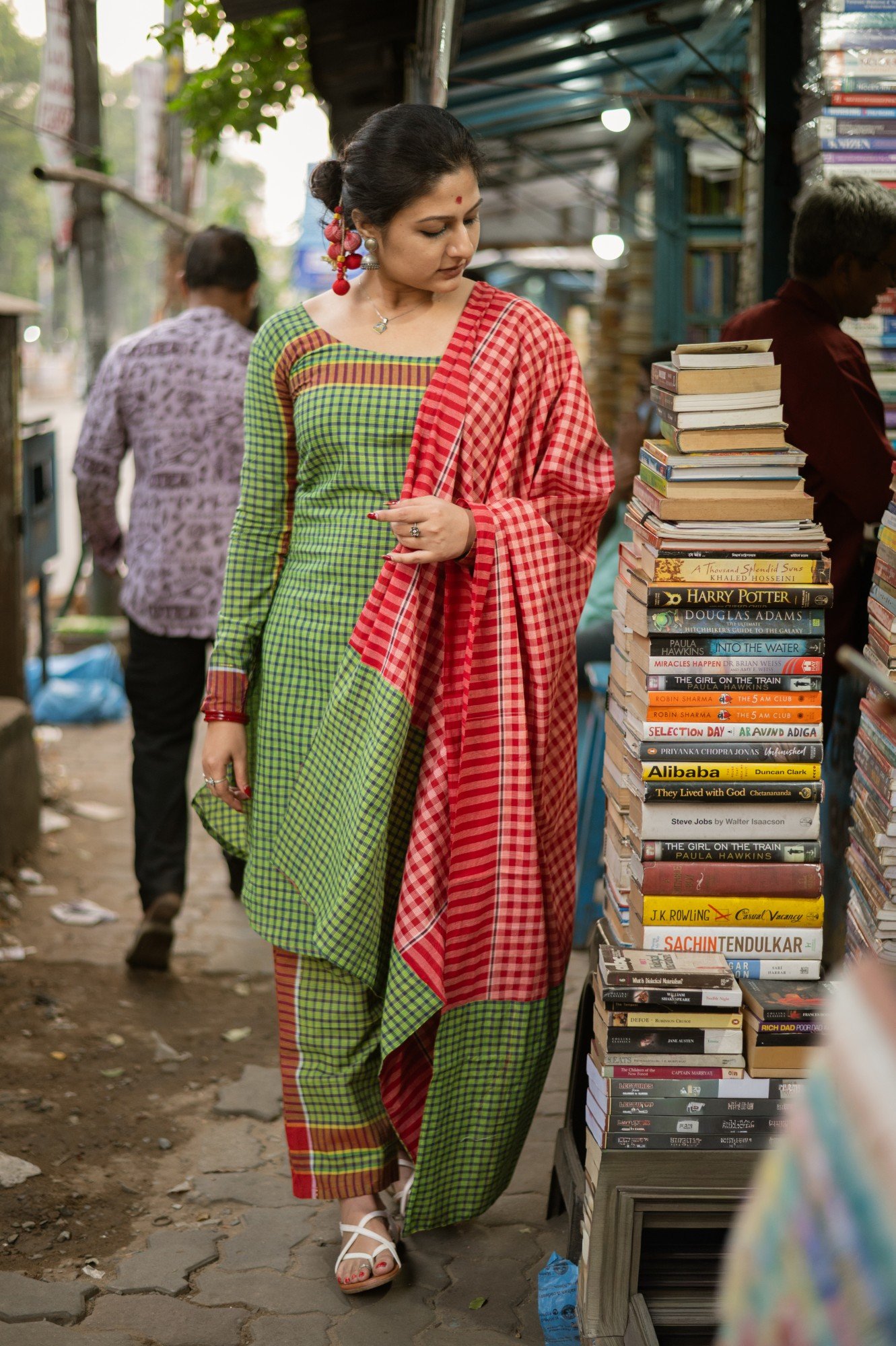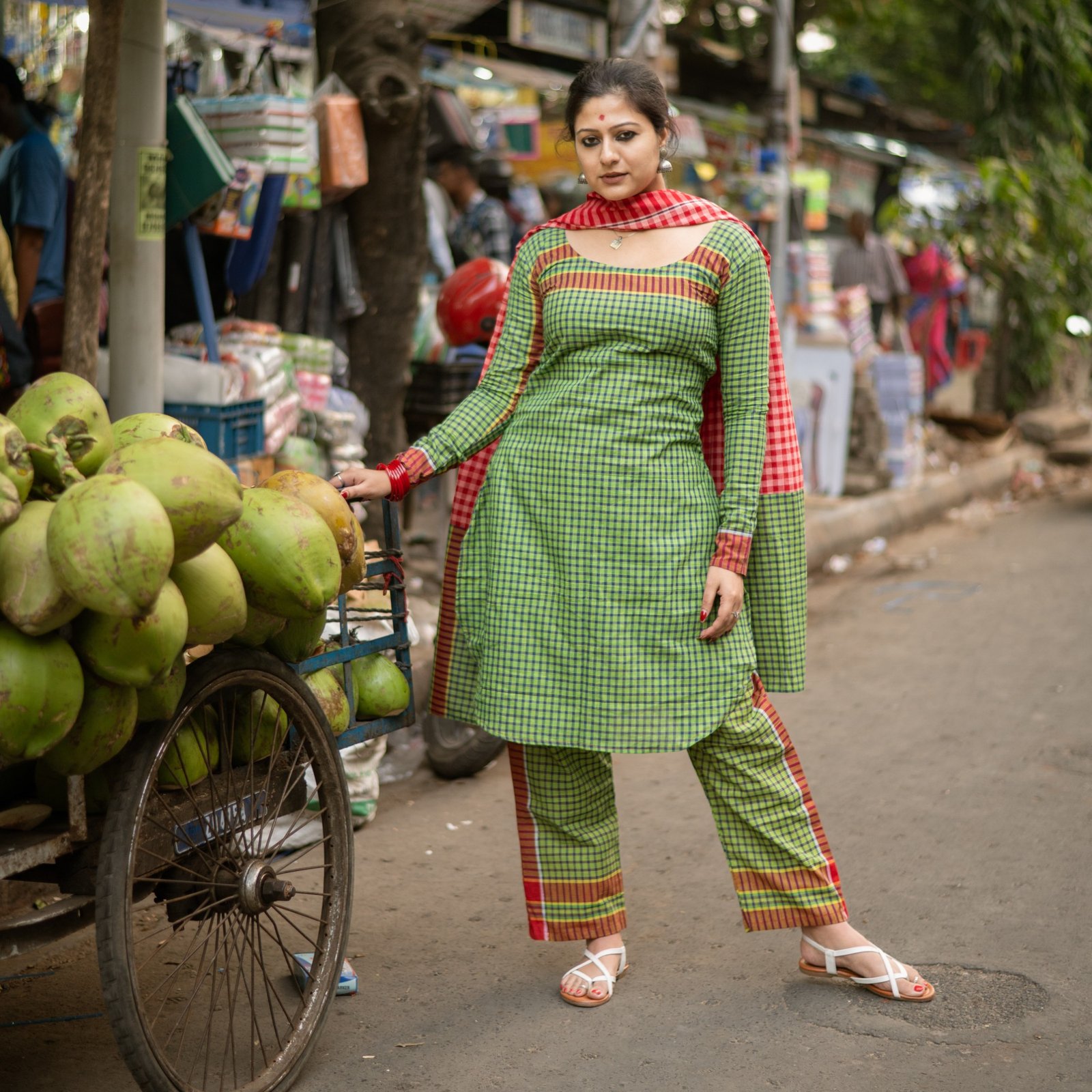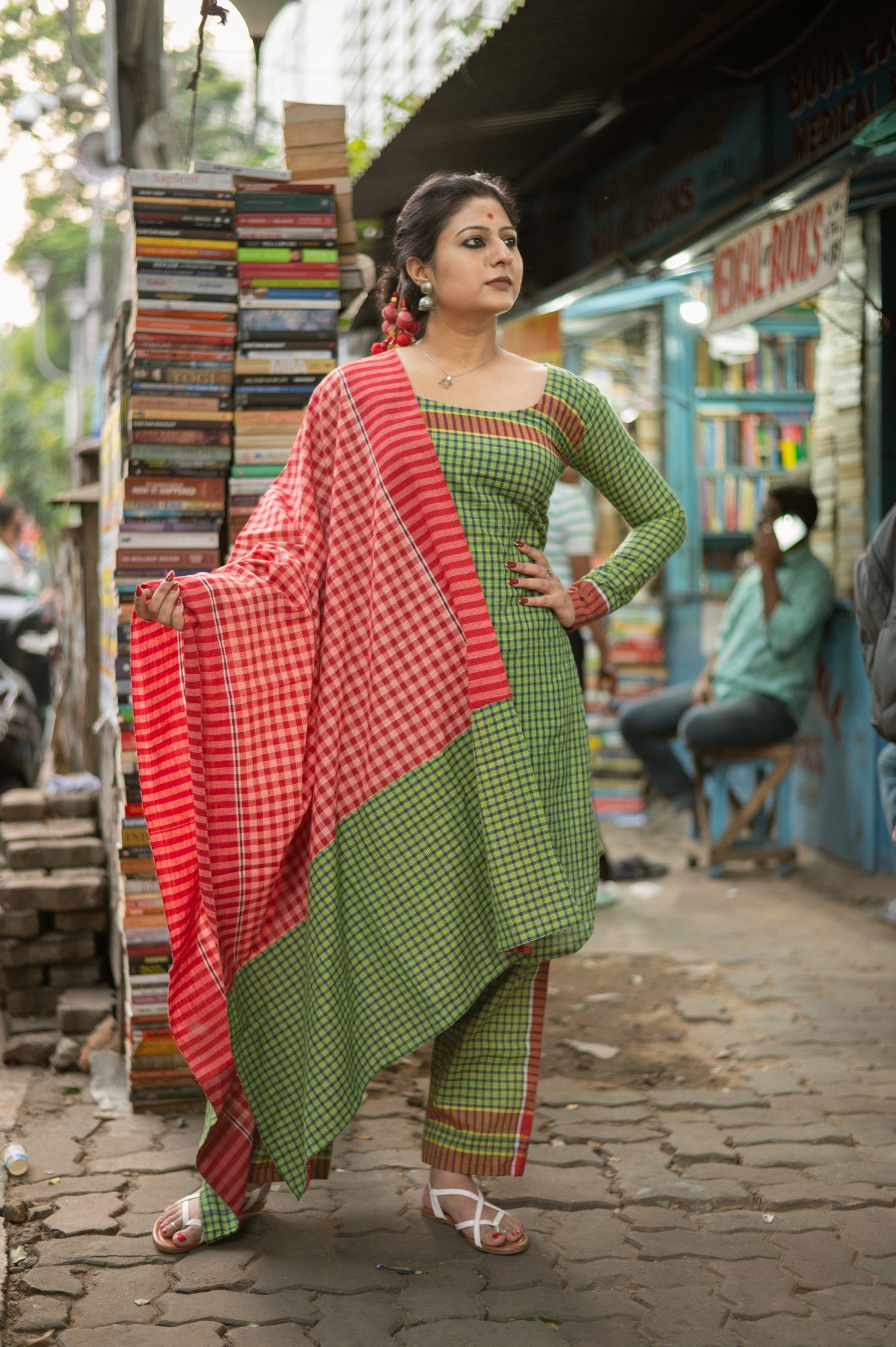 Product description : Kurta made from indigenous handloom gamchha featuring a simple round neck with curved edges. Paired with straight-fit pants for a clean silhouette. The set is completed with a solid red gamchha dupatta for a bold contrast.